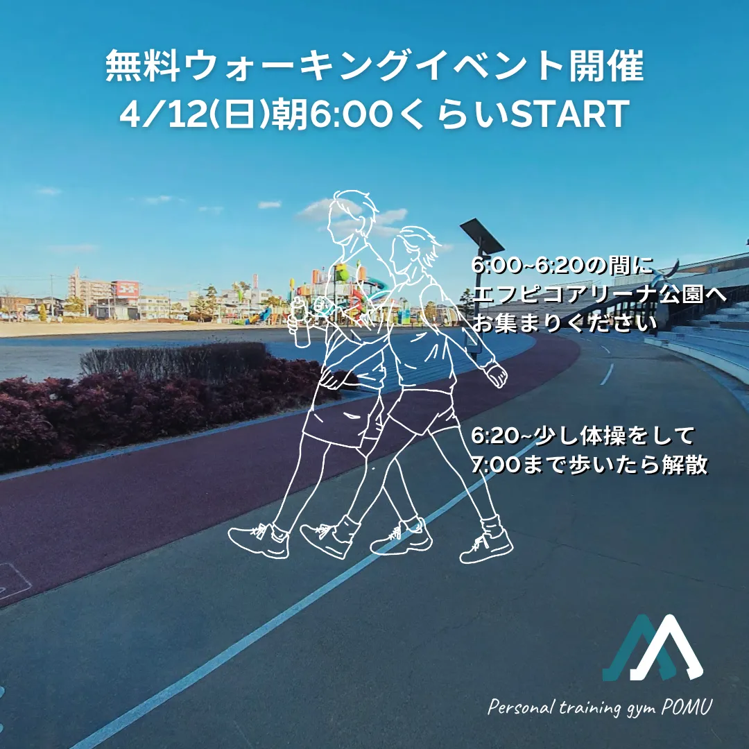 無料ウォーキングイベント開催決定! 2026/04/01 ゆるーい朝活会を実施します! 日 時: 2026年4月12日(日)6:00-7:00 場 所: エフピコアリーナふくやま 〒720-0823 広島県福山市千代田町1丁目1-2 対 象: 朝動きたい方ならだれでも 定 員: 8名くらい 参加費: 無料 お申し込みは各SNSのDMまたは歩夢公式LINEにてお声がけください! 公式LINE登録